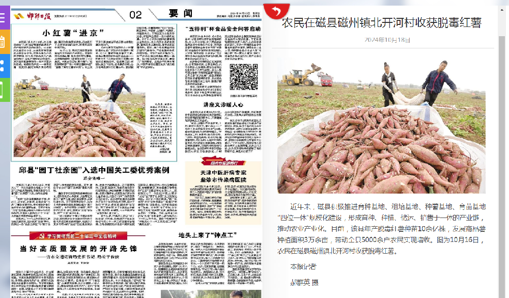 2024Äê10ÔÂ18ÈÕ£¬ºªµ¦ÈÕ±¨¿¯µÇ¡¶Å©ÃñÔÚ´ÅÖÝÕò±±¿ªºÓ´åÊÕ»ñÍѶ¾ºìÊí¡·£¬¾Û½¹´ÅÏØÍѶ¾¸ÊÊíÕâÒ»ÌØÉ«Å©Òµ¹¤Òµ¡£´ÅÏØÖÂÁ¦ÓÚÍÆ½øÓýÖÖ»ùµØ¡¢×éÅà»ùµØ¡¢ÖÖÊí»ùµØ¡¢ÓýÃç»ùµØ¡°ËÄλһÌ塱¹æÄ£»¯½¨É裬ÐγÉÓýÖÖ¡¢ÖÖÖ²¡¢´¢ÔË¡¢ÏúÊÛÓÚÒ»ÌåµÄ¹¤ÒµÁ´£¬Íƶ¯Å©Òµ¹¤Òµ»¯£¬·¢¶¯È«ÏØÔöÊÕ¡£¡°Ðºªµ¦¡±¿Í»§¶ËÏßÉÏÆ½Ì¨×ª·¢¸Ãƪ±¨µÀ¡£