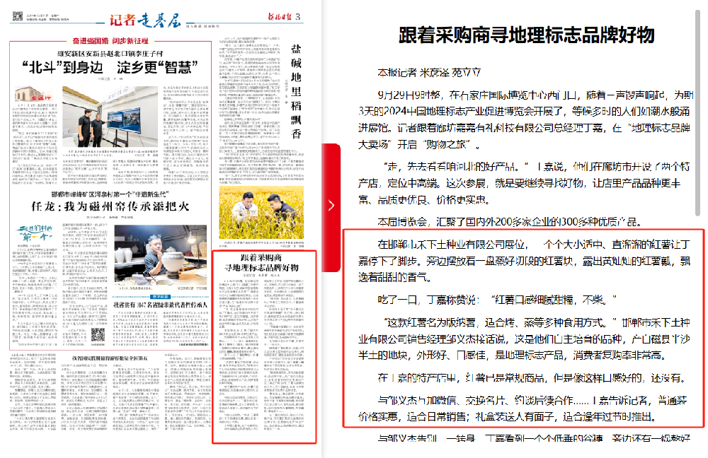 2024Äê10ÔÂ21ÈÕ£¬ºÓ±±ÈÕ±¨¡°¼ÇÕß×ßϲ㡱°æ¿é¿¯µÇ¡¶Ëæ×ŲɹºÉÌ Ñ°µØÓß±ê¼ÇÆ·ÅÆºÃÎï¡·£¬±¨µÀÁË9ÔÂÔÚʯ¼Ò×¯Â¡ÖØ¾ÙÐеÄ2024ÖйúµØÓß±ê¼Ç¹¤ÒµÔö½ø²©ÀÀ»á¡£Õⳡ²©ÀÀ»á»ã¾ÛÁ˺£ÄÚÍâ200¶à¼ÒÆóÒµµÄ300¶àÖÖÓÅÖʲúÆ·£¬ÆäÖУ¬×¯ÏйÙÍøÕ¹³öµÄµØÓß±ê¼Ç²úÆ·¡°´ÅÏØºìÊí¡±ÓÈΪÒýÈËעĿ¡£°æÄÉÊíÆ¾½èƽ»¬Ï¸ÄåµÄÍâ±í¡¢ÔȳÆÃÀ¹ÛµÄÊíÐÎÒÔ¼°ÌðÅ´ÈóÏãµÄ¿Ú¸Ð£¬Ó®µÃÁËÏÖ³¡²É¹ºÉ̵ÄÇàíù£¬²¢Á¢¼´±í´ïÁËÓëׯÏйÙÍø¾Í¡°´ÅÏØºìÊí¡±½øÐжԽÓÏàÖúµÄÒâÔ¸¡£
